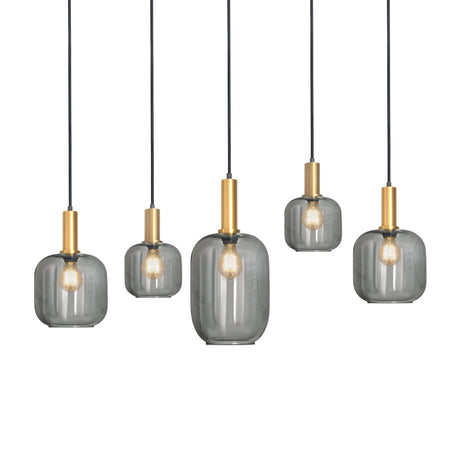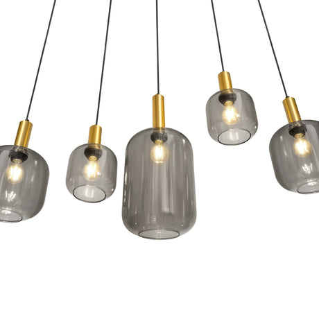 Pendelleuchte oval, schwarz mit goldfarbenen Akzenten und Smoke-Glas, 5-flammig