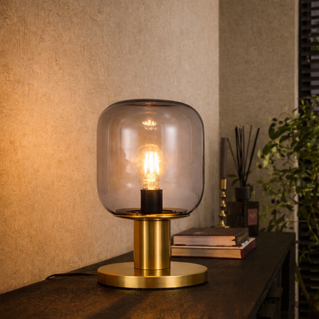 Normaler Preis Adviesprijs :€64,99 Verkaufspreis €49,99Grundpreis /Nicht verfügbar Tischlampe Laura – Messing mit Rauchglas