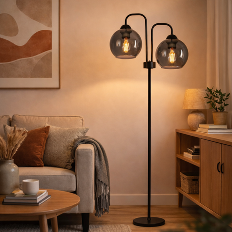 Normaler Preis Adviesprijs :€114,99 Verkaufspreis €99,99Grundpreis /Nicht verfügbarIndustrielle Stehleuchte 2-flammig 'Smoke'